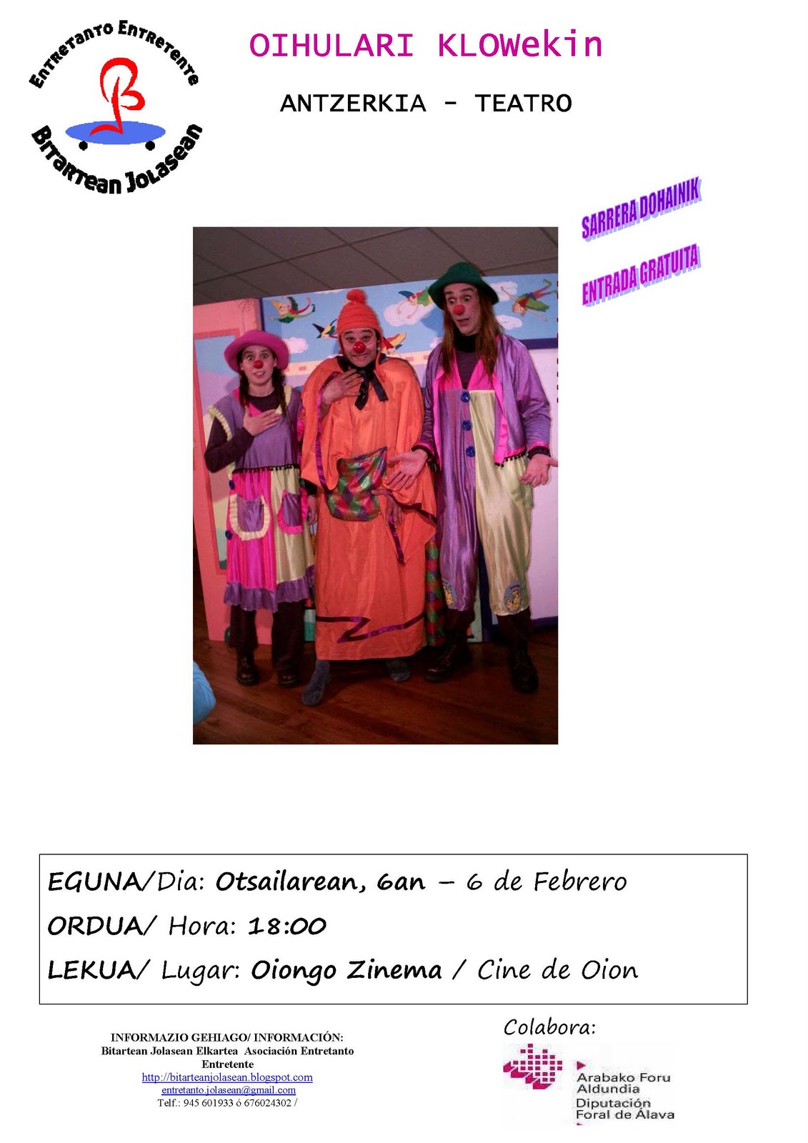 25 enero, 201015 mayo, 2019 entretantoentretente Espectáculo infantil de Klow. El sábado 6 de febrero a las 18h. Espectáculo infantil de Klow. Título de la obra: Alfonbra magikoa Grupo de Klow: Oihulari Klow Compártelo: Haz clic para compartir en X (Se abre en una ventana nueva) X Haz clic para compartir en Facebook (Se abre en una ventana nueva) Facebook Me gusta Cargando... Relacionado