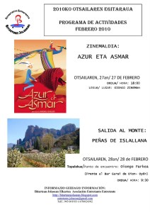 Hemos preparado dos actividades para este fin de semana: 27-2-10. Cine en euskera, con subtítulos en castellano y para toda la familia. 28-2-10. Salida al monte de Islallana (esperemos que este día podamos realizarla).