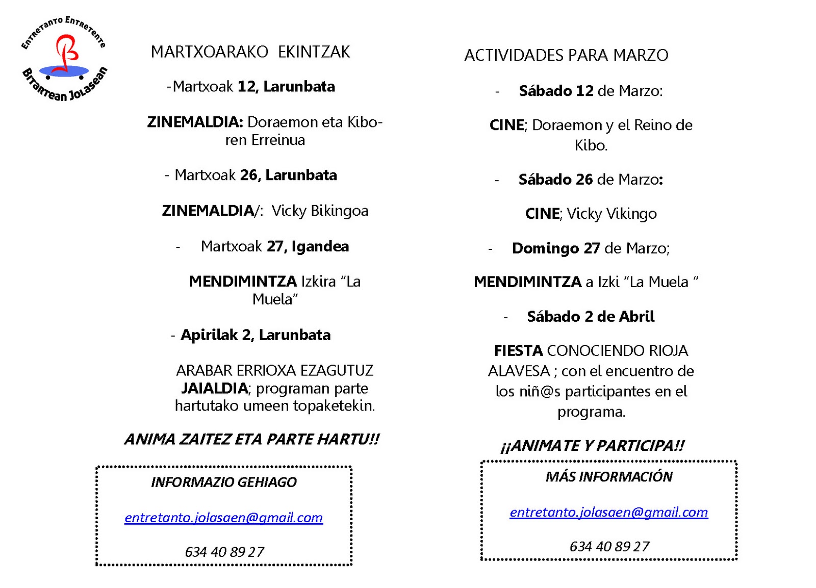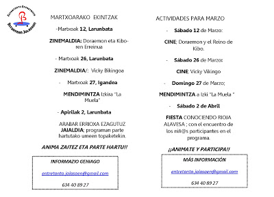 9 marzo, 20115 agosto, 2020 entretantoentretente Actividades para marzo de 2011 Kaixo! Hemen bidaltzen dizuet Martxoan burutuko ditugun ekintzen zerrenda. ANIMATU ZAITEZ ETA PARTE HARTU! Hola! Aquí os dejo la hoja informativa con las actividades que realizaremos en Marzo. ANIMAOS Y PARTICIPAD!! Compártelo: Compartir en X (Se abre en una ventana nueva) X Comparte en Facebook (Se abre en una ventana nueva) Facebook Me gusta Cargando... Relacionado