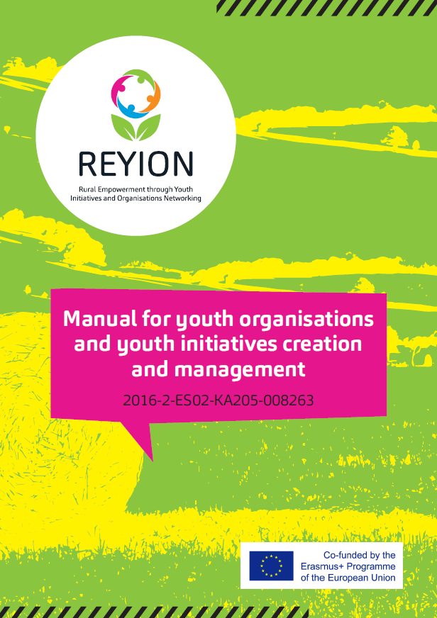 This manual is the final output developed and obtained during the implementation of the so called project. «ReYion: Rural Empowerment through Youth Initiatives and Organisations Networking». This manual is the main output obtained during the 19-month cooperation of all the project partners with the support of the young people and youth entities located on the rural areas on which the project materials were tested. It contains pedagogical milestones for those professionals on the youth sector who could aim to replicate them within their organisations and communities. This material is available in all the project languages (Czech, English, Italian, Greek, Slovenian and Spanish) and can be downloaded from the project website (that also includes a compendium of all the youth groups or initiatives developed by the beneficiaries of ReYion during the, implementation of its programme).