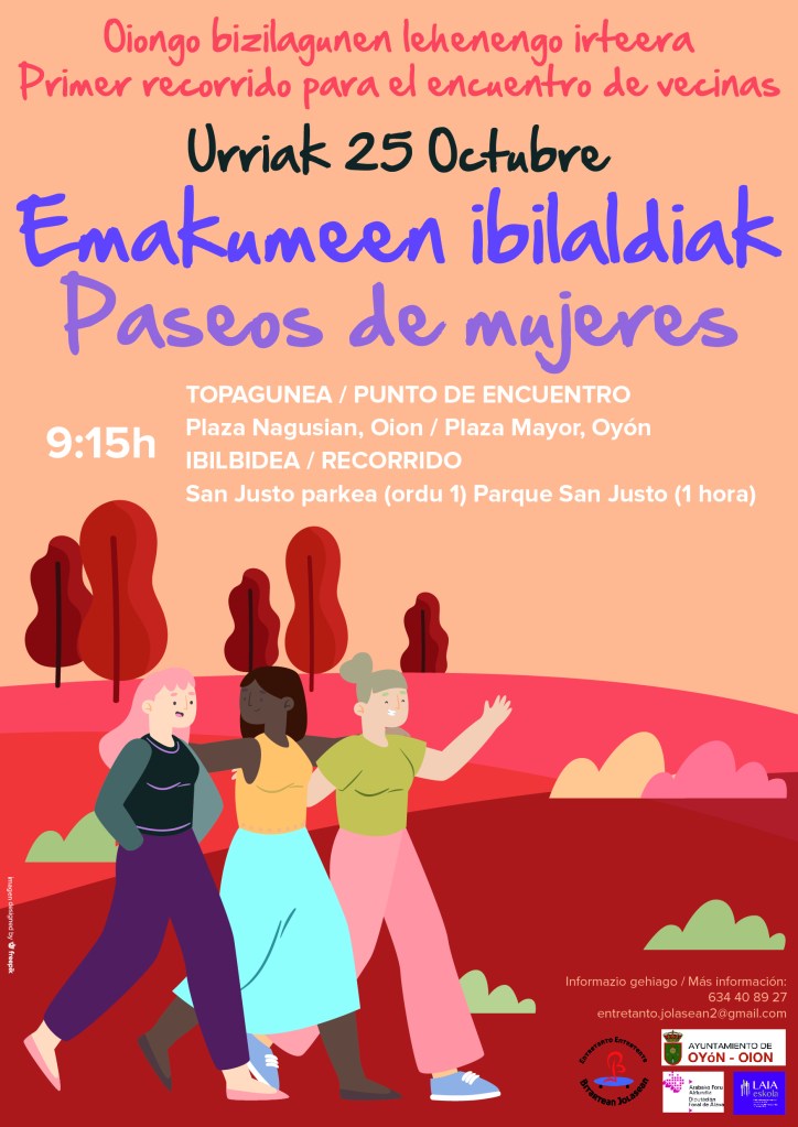 Emakumeen Ibilaldiak, aisialdi ekintza osasuntsu izateaz gain kultura desberdinetako emakumeen artean partekatzeko, ehuntzeko eta sororitatea sustatzeko aukera dira. Oiongo bizilagunen lehenengo irteera datorren ostiralean izango da, urriaren 25ean! Oiongo plaza nagusian 9.15etan topatuko gara, ibilbidea erraza izango da San Justo parkera joango gara 🙂