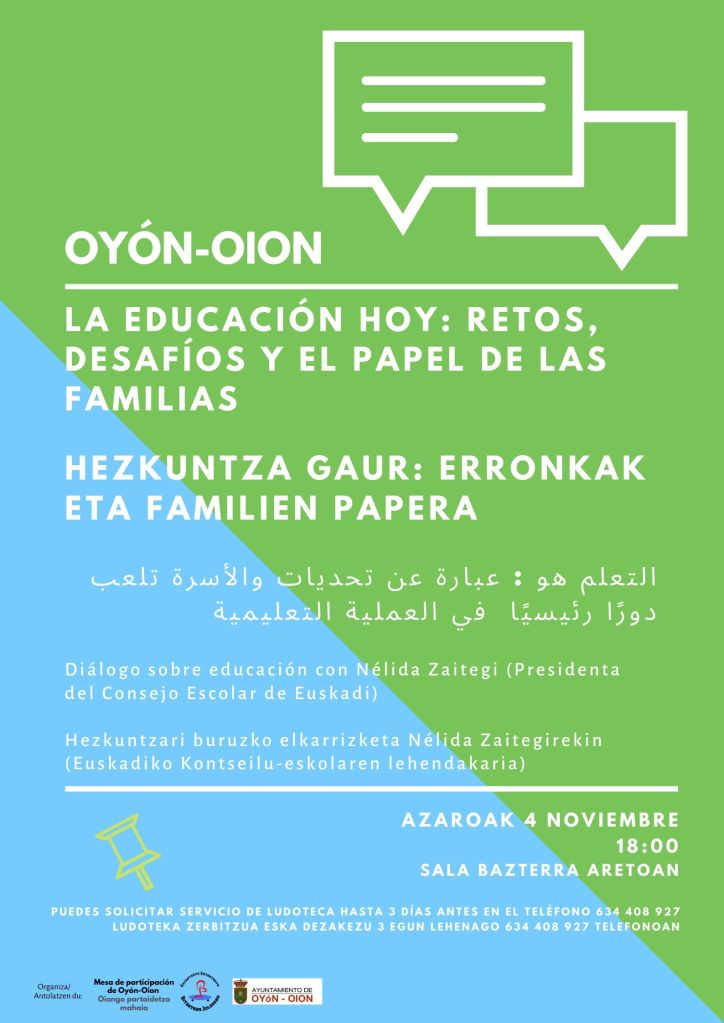 El próximo lunes 4 de Noviembre en Oyón y el martes 5 de Noviembre en Labastida tendremos un diálogo sobre “La educación hoy: retos, desafíos y el papel de las familias” de la mano de Nélida Zaitegi, presidenta del Consejo Escolar de Euskadi.