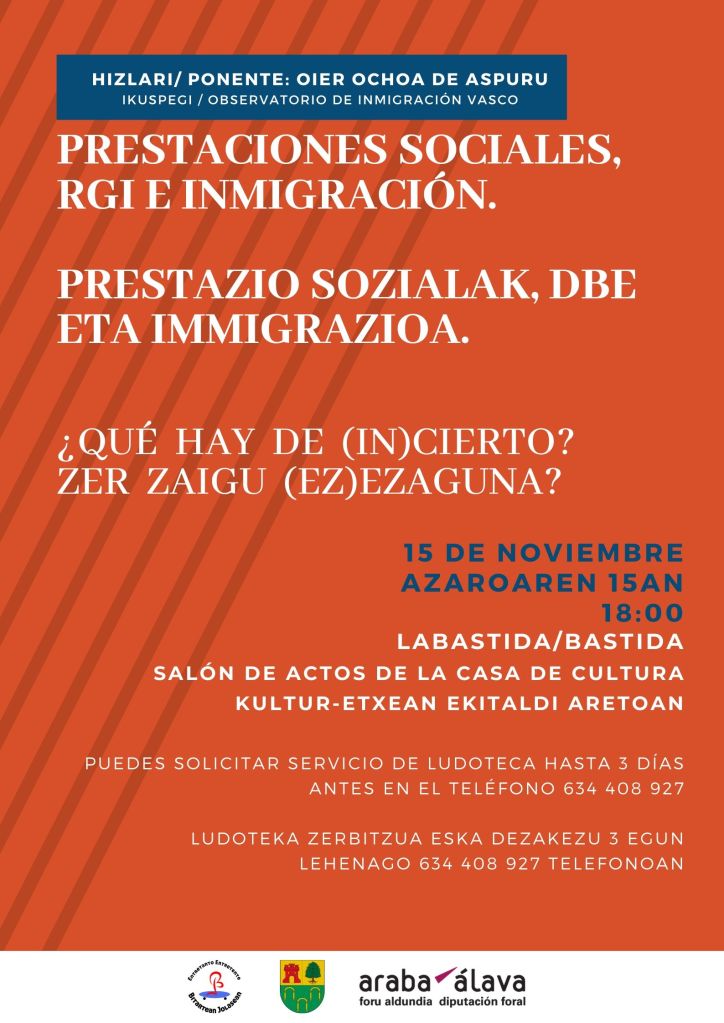 Ba al dago immigranteentzako diru-laguntza zehatzik? Sarbide baldintzak berdinak al dira pertsona guztientzat? Zer zaigu ez(ezaguna) Arabako Errioxan bizi diren atzerritarrak prestazio sozialen eta DBEren onuradun nagusiak direla? Gizarte laguntzaren inguruan kezka eta zurrumurru ugari daude. Ez pentsa eta zoaz hitzaldi interesgarri eta beharrezko honetara! Eskatzen dutenentzako ludoteka zerbitzua egongo da.