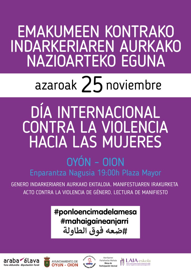 Aurten azaroaren 25a emakumeen aurkako indarkeriaren aurkako Nazioarteko eguna dela eta, Oyónen #ponloencimadelamesa, #mahaigaineanjarri ضعه فوق الطاولة # lema aukeratu dute