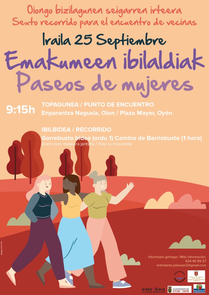 Comienza el otoño, y para inaugurarlo os invitamos a las vecinas de Oion este viernes día 25 de septiembre a pasear y seguir con buenos hábitos saludables y de encuentro. A pesar de las dificultades del momento, creemos que es más importante que nunca, seguir generando red y vínculos entre las personas de nuestro municipio.