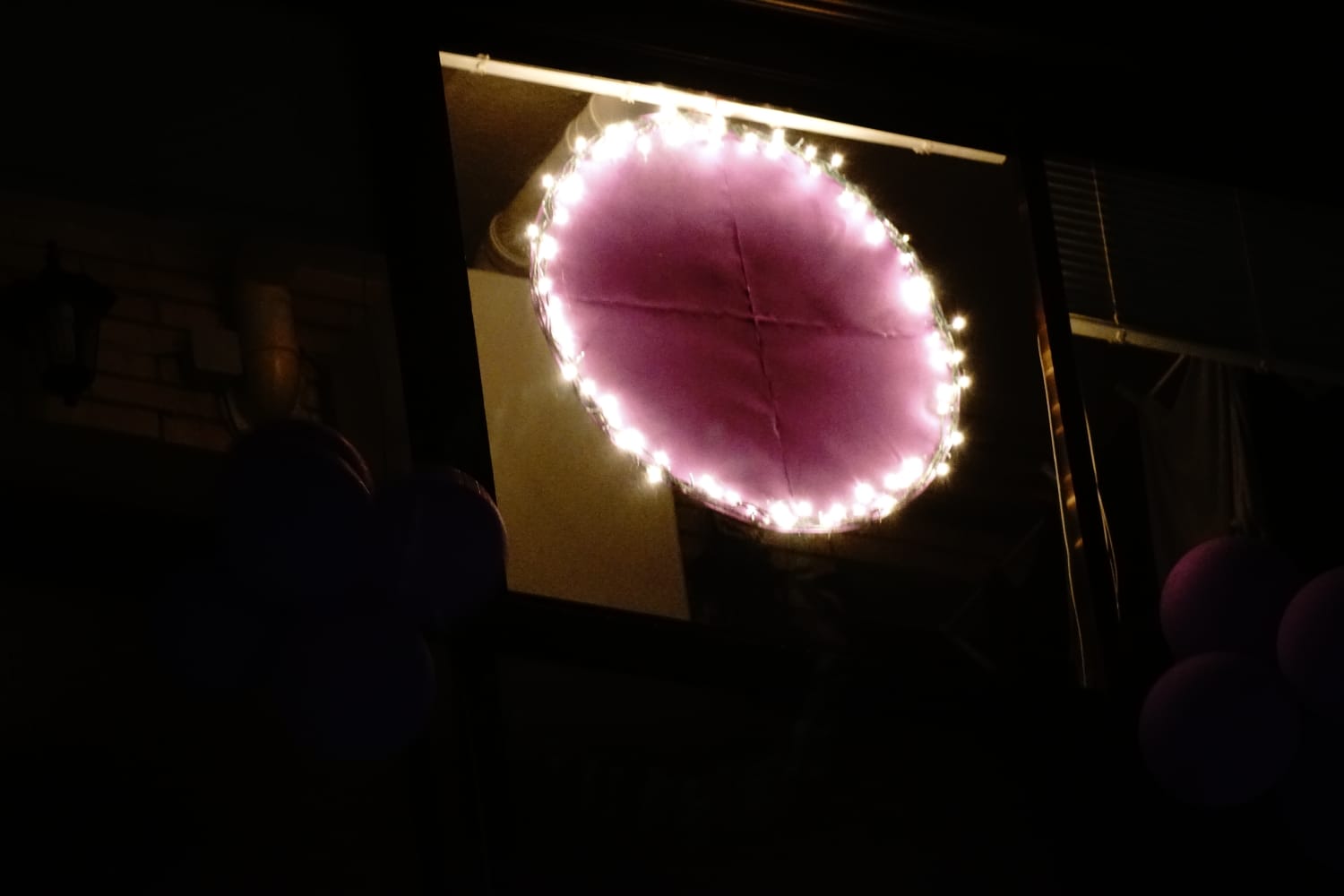- Realiza un punto morado y colócalo en tu balcón, ventana, negocio, … ¡Tenemos tela de fieltro morado en la oficina pásate a por ella!