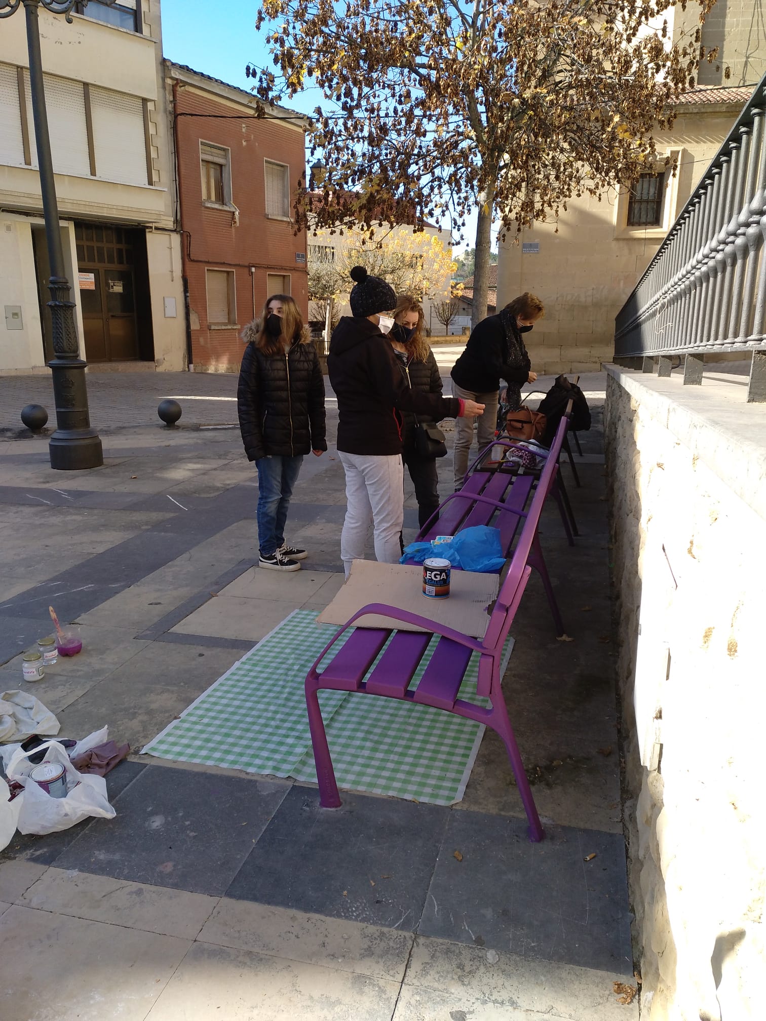 - Vamos a pintar 4 bancos de color morado con el lema de este año