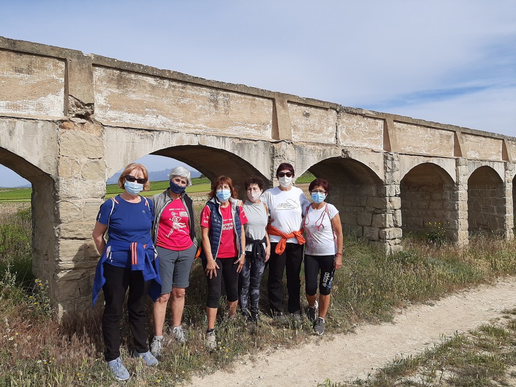 Un recorrido circular de aproximadamente 6,5 km en el que vimos el acueducto de mediados del siglo pasado. Muchas de nosotras no lo conocíamos, así que aprovechamos a hacer un juego para poner a prueba la sabiduría popular. Sin premios, pero sin presión. Al final, cada una aporta algo de información de lo que sabe, de lo que ha oído, de lo que ha vivido… Así que juntas viajamos al pasado, a cuando corría agua por el acueducto y había que limpiar los regajos, a cuando se cultivaba remolacha en estos campos, etc.
