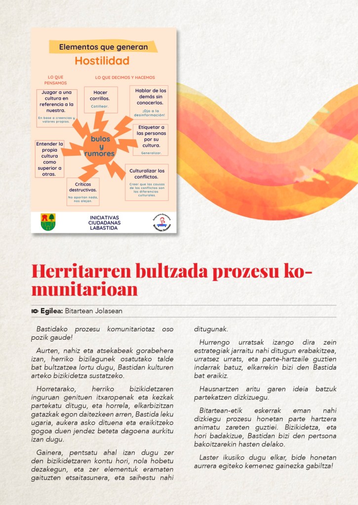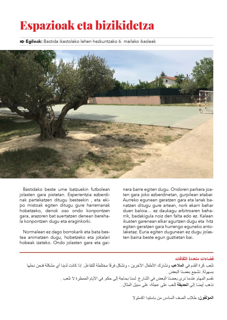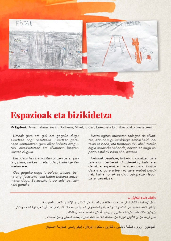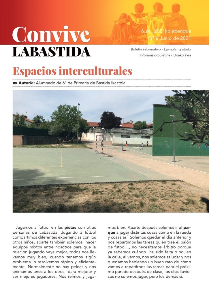 En esta ocasión ha participado el alumnado de 6º de primaria de Bastida Ikastola y del Colegio Labastida, quienes nos hablan sobre lo que representan los espacios de convivencia para ellos y ellas. Además desde el cole, comparten la experiencia del equipo que ha participado en la First Lego League. También podréis leer un cuento sobre la llegada de una persona migrante a Labastida, y enteraros de los pasos que estamos dando desde el espacio ciudadano para el impulso de la convivencia intercultural.