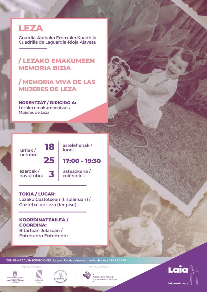 Haremos memoria de momentos, personas y lugares diversos que, unas veces, cuentan historias compartidas y, otras, diferentes. De forma guiada, y utilizando técnicas como la fotobiografía y los árboles de vida, completaremos entre todas el bosque de la Memoria Viva de Leza.
