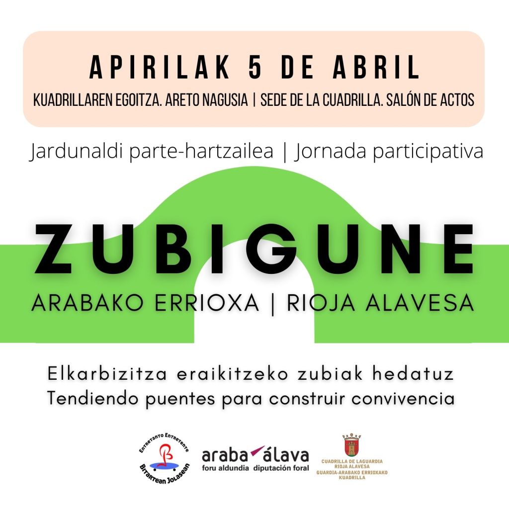 Desde Diputación Foral de Álava con la colaboración de la Cuadrilla de Rioja Alavesa y dinamizado por Bitartean Jolasean, nos gustaría invitarte a la jornada participativa Zubigune, una oportunidad para, entre todas las personas, construir una convivencia positiva y desde ella, contribuir al desarrollo en nuestros pueblos y Cuadrilla.