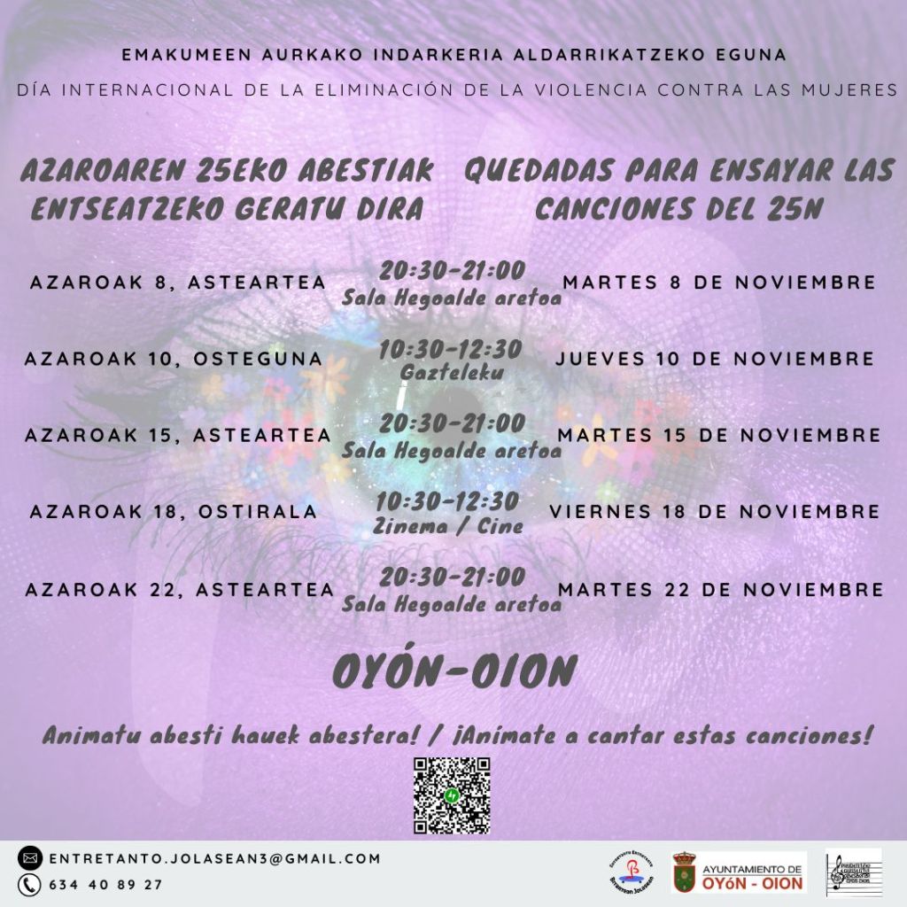 Oyón-Oionen hainbat ekintzekin bat egin ahal izango duzu: emakumeen ibilaldi bat, familia osoarentzako ipuin kontaketa bat, manifestuaren irakurketa eta indarkeriarik gabeko bizitza baten alde kantatzeko aukera, jarraian utziko dizkizugun abestiekin.