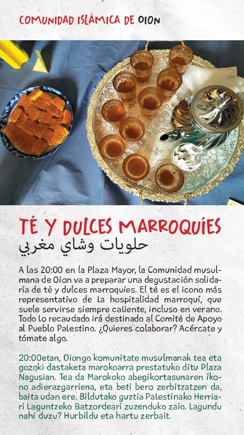 Además, a partir de las 20:00 en la Plaza Mayor, la Comunidad musulmana de Oion va a preparar una degustación solidaria de té y dulces marroquíes. El té es el icono más representativo de la hospitalidad marroquí, que suele servirse siempre caliente, incluso en verano. Todo lo recaudado en esta degustación irá destinado al Comité de Apoyo al Pueblo Palestino. ¿Quieres colaborar? Acércate y tómate algo.