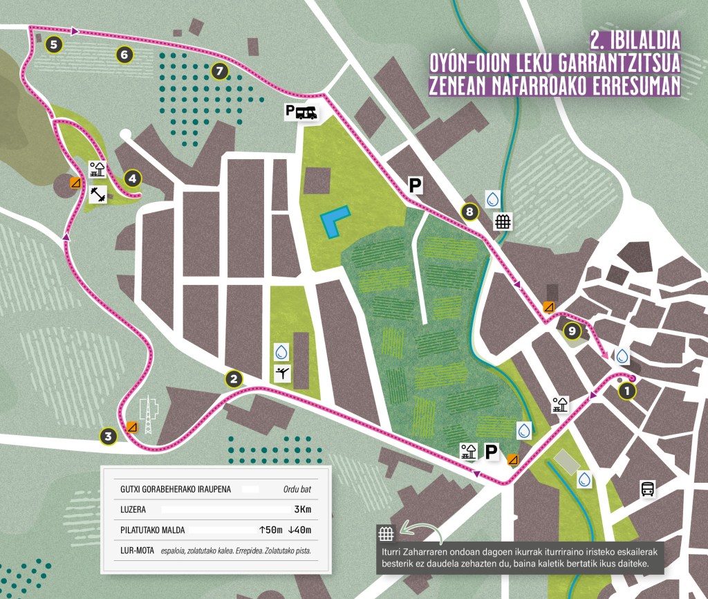 Ibilaldiaren planoan atseden hartzeko guneei, ur-puntuei, aparkalekuei, ariketak egiteko guneei edo ibilbidearen lur-motari buruzko informazio gehiago aurkituko duzu.