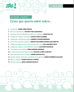 Usteak, Ustel! o cosas que quería saber sobre… es un proyecto de ZAS!, compuesto por 14 artículos sobre temas relacionados con los procesos migratorios en torno a los cuales existen frecuentemente rumores. Es pues, en cierto modo, un argumentario antirumor que ayudará a desmontar discursos xenófobos y racistas.